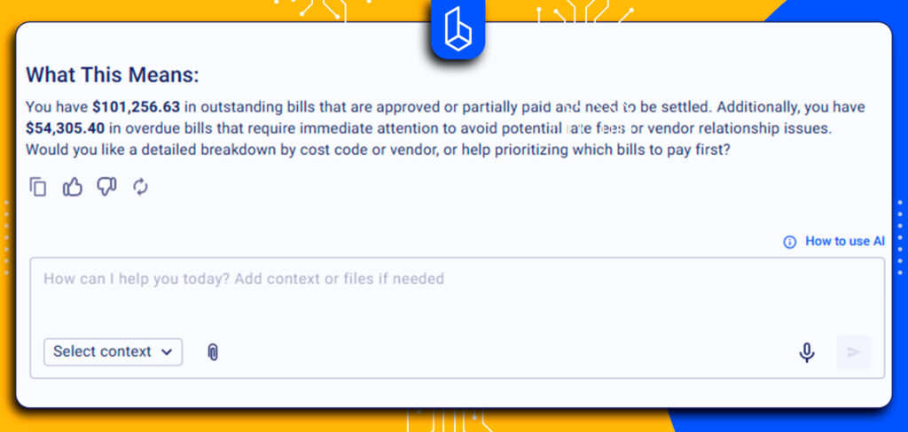 However, with the AI, the game changes completely. The AI model makes you spend even less time on the same task. Let’s take AI billing. In the past, you had to enter all information in the platform. Let’s say it took 10 minutes or more (given that a general contractor receives dozens of bills daily). Now it takes a couple of minutes.