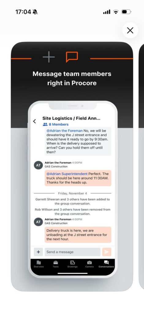 Communication is built right in. Field workers send updates, upload photos, ask questions, and the office responds all inside the app. Overall, a general contractor gets fewer missed messages, less waiting, and more alignment between the teams.