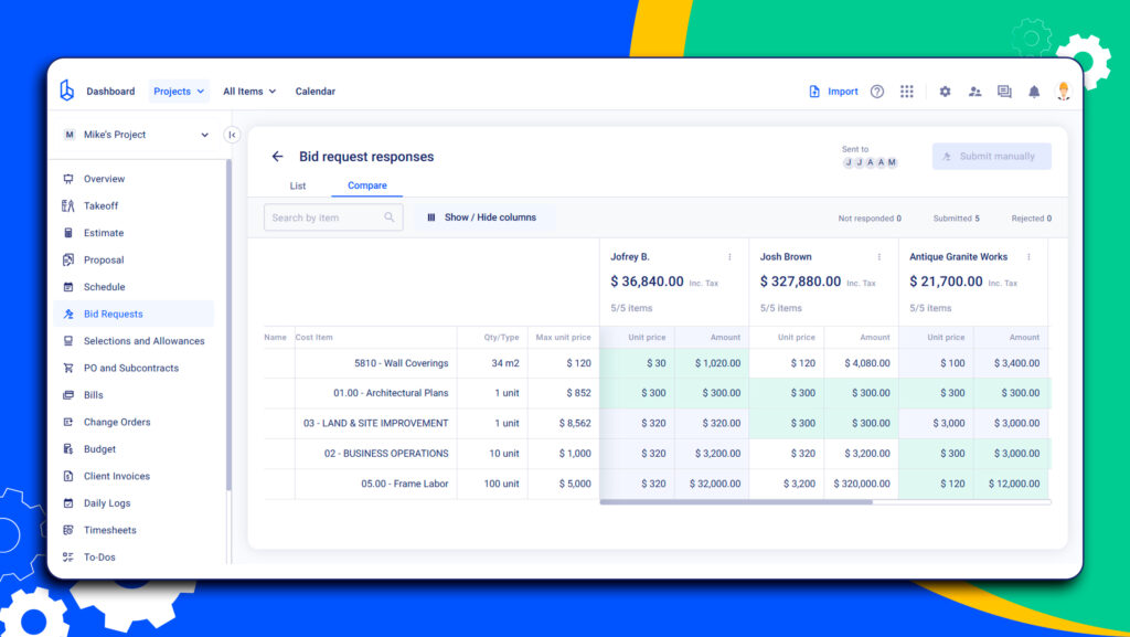 Then comes bidding when subcontractors and vendors submit their prices, timelines, and terms. This back-and-forth can get tricky as materials and timelines or even design details may shift.