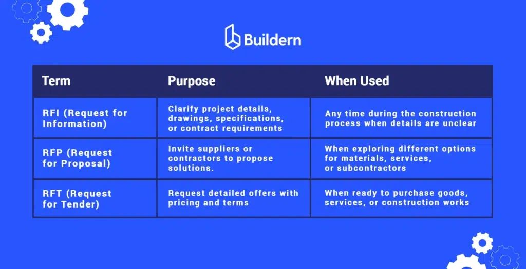 There are several terms used in the construction industry to describe procurement procedures, including Request for Proposal (RFP), and Request for Tender (RFT).